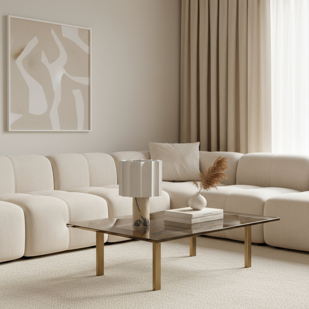 • Color: Base de mármol natural con pantalla de tela neutra