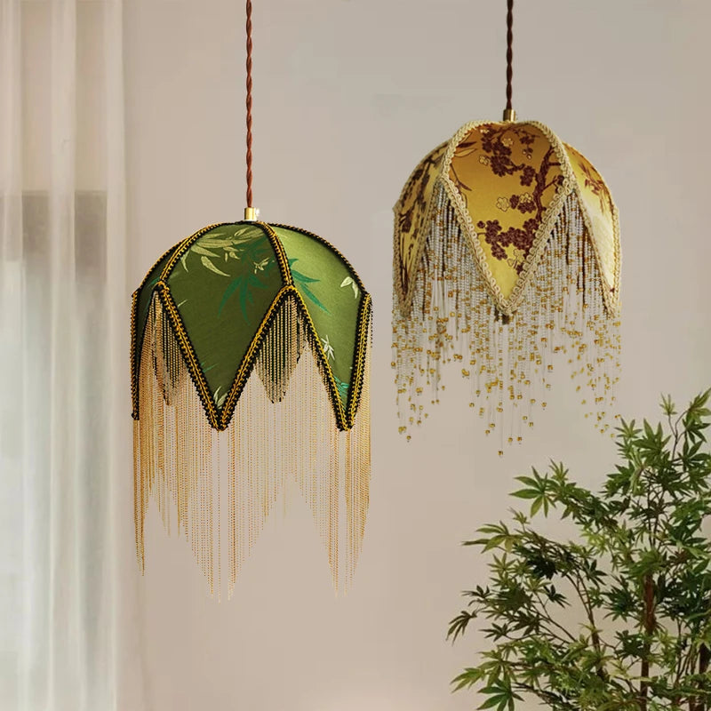 Esta lámpara colgante de tela vintage aporta un encanto nostálgico y un toque francés a tus habitaciones. Con su pantalla decorativa de tela y elegantes flecos, es un punto destacado con estilo para salas de estar, dormitorios, comedores o hoteles. Esta luz combina diseño retro con comodidad acogedora.